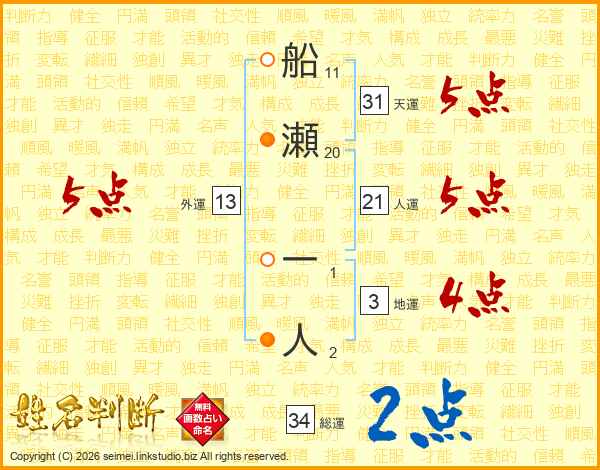 生活面を象徴する運勢です。外部から受ける影響力を表し、結婚運、家庭運や職場、環境への順応性を表します。総運から人運を引いた画数。姓や名が1文字の場合を除く。