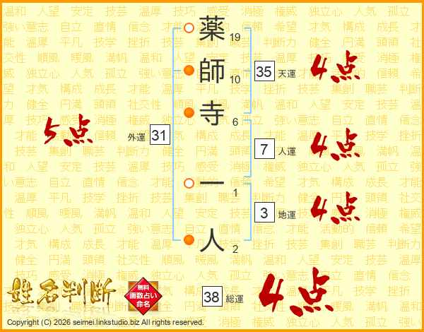 薬師寺一人さんの総運は38画の4点!