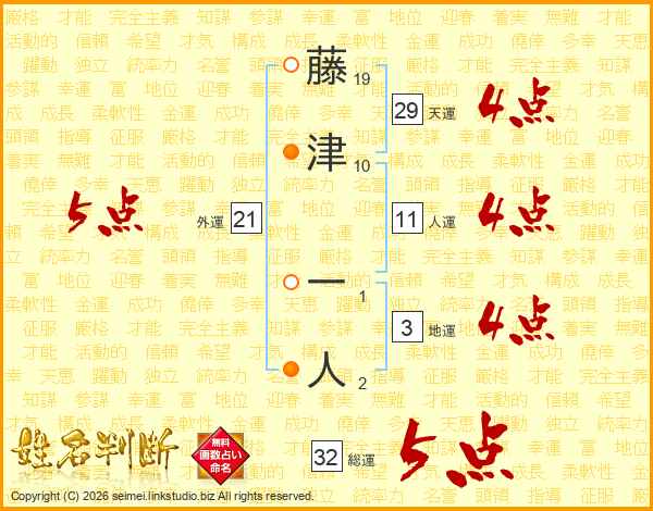 あなたの人生を表す1番重要な運勢です。生涯を通じて影響する総合運となり、主に50歳以降の晩年期に影響を及ぼします。苗字と名前の合計画数。