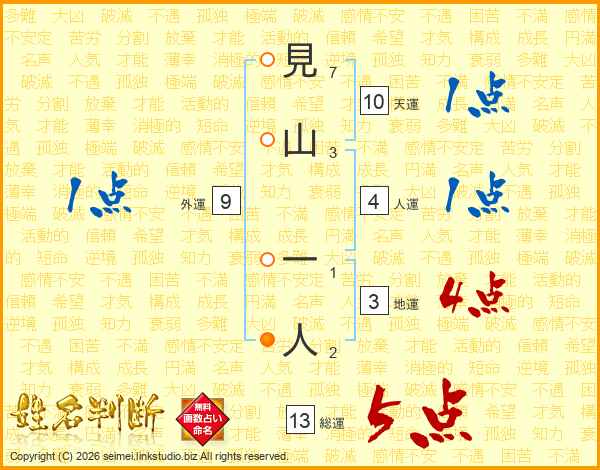 生活面を象徴する運勢です。外部から受ける影響力を表し、結婚運、家庭運や職場、環境への順応性を表します。総運から人運を引いた画数。姓や名が1文字の場合を除く。