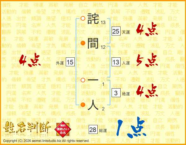 詫間一人さんの人運は13画の5点!