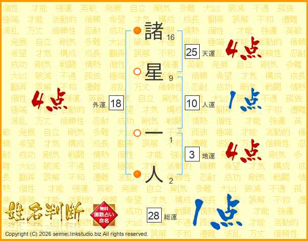 生活面を象徴する運勢です。外部から受ける影響力を表し、結婚運、家庭運や職場、環境への順応性を表します。総運から人運を引いた画数。姓や名が1文字の場合を除く。