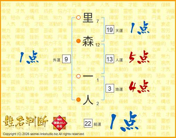 生活面を象徴する運勢です。外部から受ける影響力を表し、結婚運、家庭運や職場、環境への順応性を表します。総運から人運を引いた画数。姓や名が1文字の場合を除く。