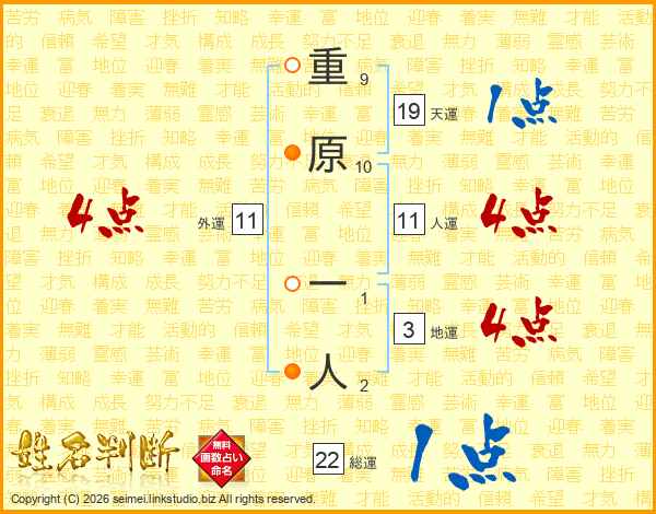 生活面を象徴する運勢です。外部から受ける影響力を表し、結婚運、家庭運や職場、環境への順応性を表します。総運から人運を引いた画数。姓や名が1文字の場合を除く。