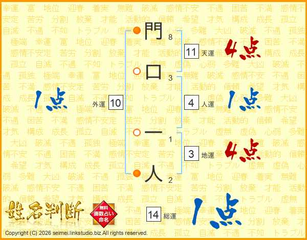 生活面を象徴する運勢です。外部から受ける影響力を表し、結婚運、家庭運や職場、環境への順応性を表します。総運から人運を引いた画数。姓や名が1文字の場合を除く。