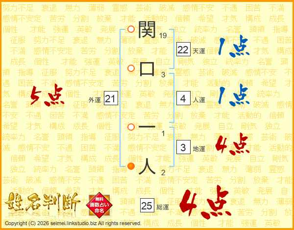 生活面を象徴する運勢です。外部から受ける影響力を表し、結婚運、家庭運や職場、環境への順応性を表します。総運から人運を引いた画数。姓や名が1文字の場合を除く。