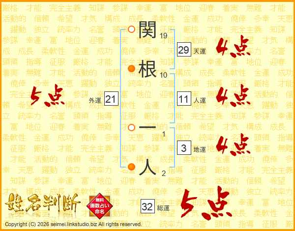 関根一人さんの総運は32画の5点!