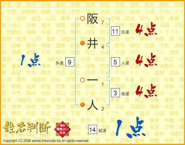 生活面を象徴する運勢です。外部から受ける影響力を表し、結婚運、家庭運や職場、環境への順応性を表します。総運から人運を引いた画数。姓や名が1文字の場合を除く。