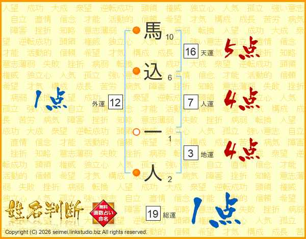 生活面を象徴する運勢です。外部から受ける影響力を表し、結婚運、家庭運や職場、環境への順応性を表します。総運から人運を引いた画数。姓や名が1文字の場合を除く。