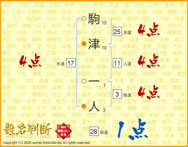 生活面を象徴する運勢です。外部から受ける影響力を表し、結婚運、家庭運や職場、環境への順応性を表します。総運から人運を引いた画数。姓や名が1文字の場合を除く。