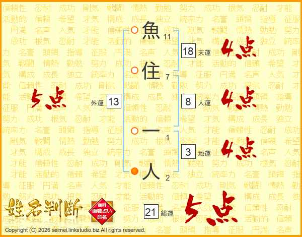 生活面を象徴する運勢です。外部から受ける影響力を表し、結婚運、家庭運や職場、環境への順応性を表します。総運から人運を引いた画数。姓や名が1文字の場合を除く。