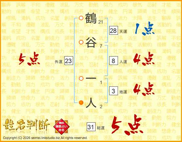 鶴(21画)谷(7画) 一(1画)人(2画)