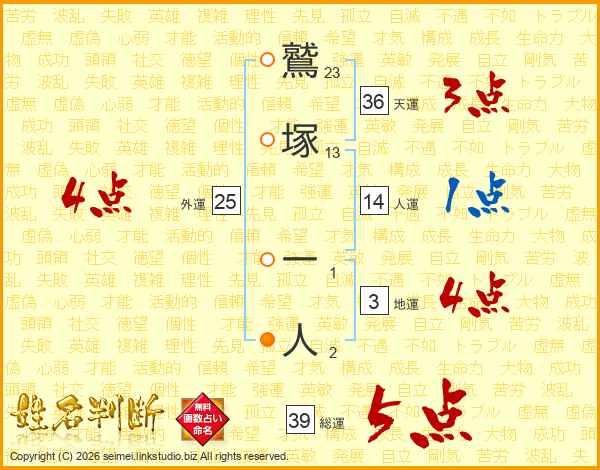 鷲(23画)塚(13画) 一(1画)人(2画)