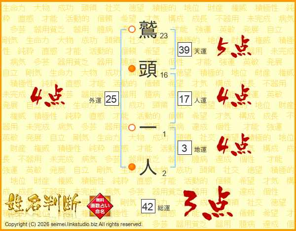 鷲(23画)頭(16画) 一(1画)人(2画)