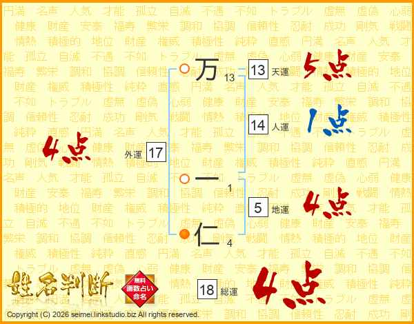 万(13画) 一(1画)仁(4画)