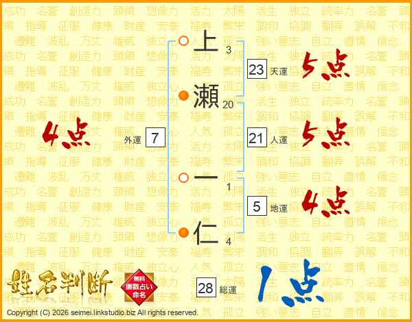 上(3画)瀬(20画) 一(1画)仁(4画)