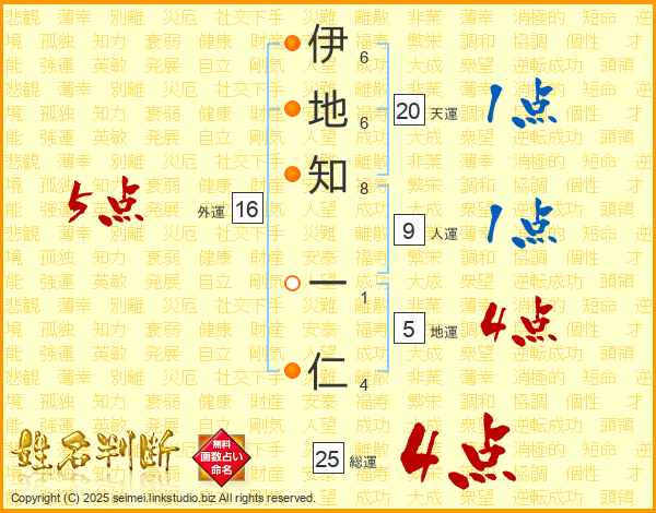 伊(6画)地(6画)知(8画) 一(1画)仁(4画)