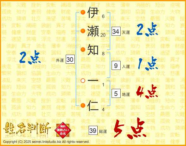 伊瀬知一仁さんの総運は39画の5点!