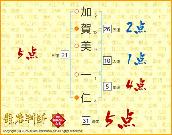 加(5画)賀(12画)美(9画) 一(1画)仁(4画)