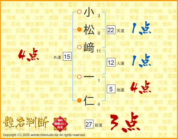 小(3画)松(8画)﨑(11画) 一(1画)仁(4画)