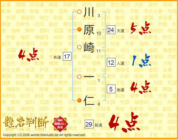 川(3画)原(10画)崎(11画) 一(1画)仁(4画)