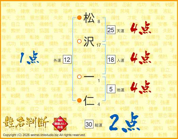 生活面を象徴する運勢です。外部から受ける影響力を表し、結婚運、家庭運や職場、環境への順応性を表します。総運から人運を引いた画数。姓や名が1文字の場合を除く。