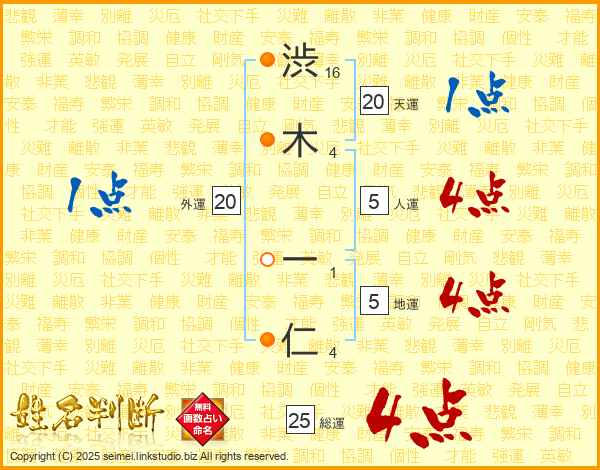 あなたの人生を表す1番重要な運勢です。生涯を通じて影響する総合運となり、主に50歳以降の晩年期に影響を及ぼします。苗字と名前の合計画数。