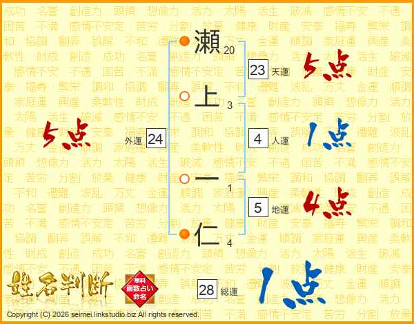 瀬(20画)上(3画) 一(1画)仁(4画)
