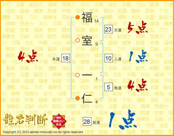 生活面を象徴する運勢です。外部から受ける影響力を表し、結婚運、家庭運や職場、環境への順応性を表します。総運から人運を引いた画数。姓や名が1文字の場合を除く。