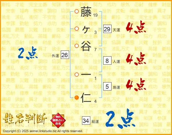 藤(19画)ヶ(3画)谷(7画) 一(1画)仁(4画)