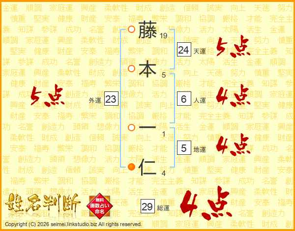 藤(19画)本(5画) 一(1画)仁(4画)