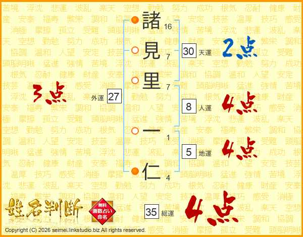 諸(16画)見(7画)里(7画) 一(1画)仁(4画)