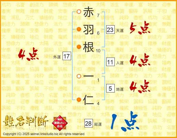 赤(7画)羽(6画)根(10画) 一(1画)仁(4画)