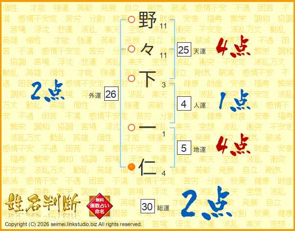 野(11画)々(11画)下(3画) 一(1画)仁(4画)