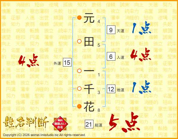元(4画)田(5画) 一(1画)千(3画)花(8画)