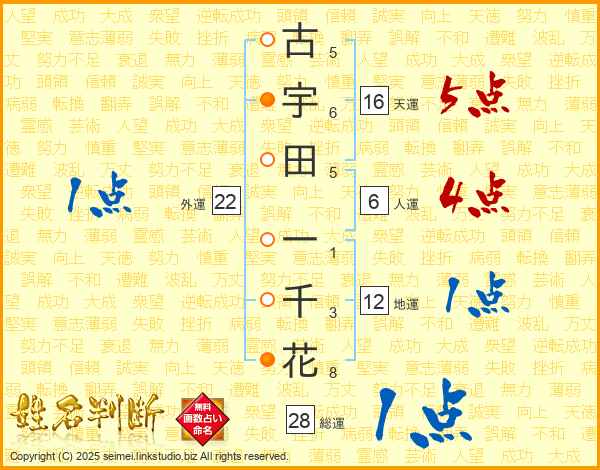 古(5画)宇(6画)田(5画) 一(1画)千(3画)花(8画)