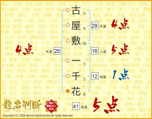 古(5画)屋(9画)敷(15画) 一(1画)千(3画)花(8画)