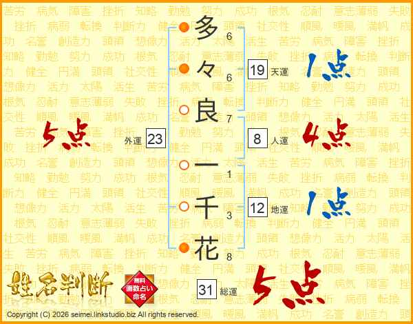 多々良一千花さんの総運は31画の5点!