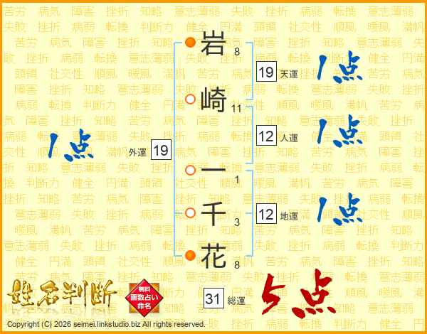 岩(8画)崎(11画) 一(1画)千(3画)花(8画)
