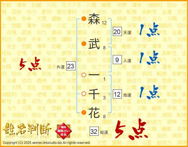 森(12画)武(8画) 一(1画)千(3画)花(8画)