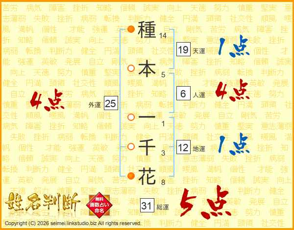 種(14画)本(5画) 一(1画)千(3画)花(8画)