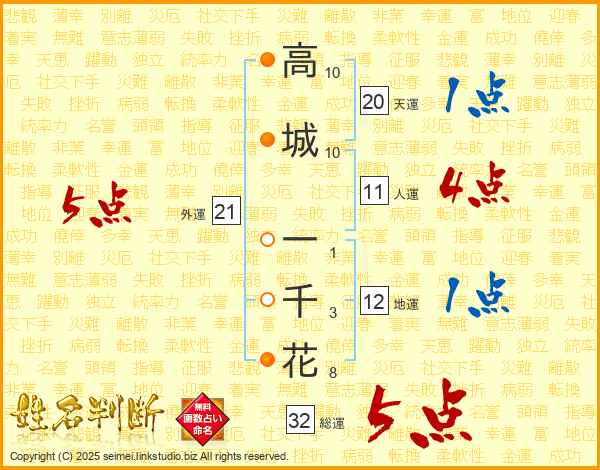 生活面を象徴する運勢です。外部から受ける影響力を表し、結婚運、家庭運や職場、環境への順応性を表します。総運から人運を引いた画数。姓や名が1文字の場合を除く。
