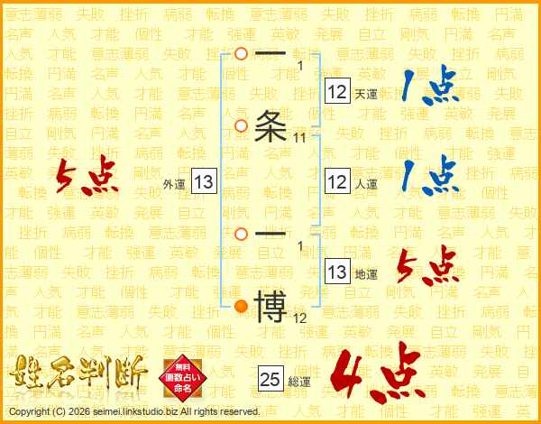 あなたの人生を表す1番重要な運勢です。生涯を通じて影響する総合運となり、主に50歳以降の晩年期に影響を及ぼします。苗字と名前の合計画数。