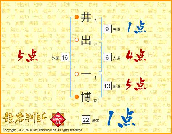 生活面を象徴する運勢です。外部から受ける影響力を表し、結婚運、家庭運や職場、環境への順応性を表します。総運から人運を引いた画数。姓や名が1文字の場合を除く。