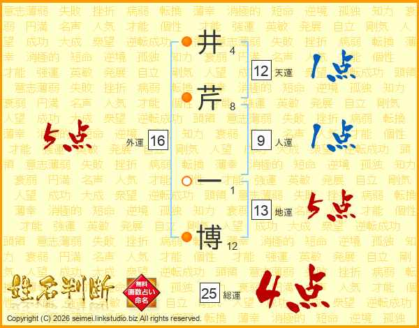生活面を象徴する運勢です。外部から受ける影響力を表し、結婚運、家庭運や職場、環境への順応性を表します。総運から人運を引いた画数。姓や名が1文字の場合を除く。