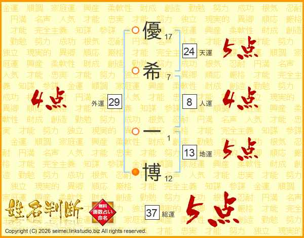 画数の奇数(○陽)と偶数(●陰)の配列で吉凶を占います。どちらかにかたよる名前は大凶名で避ける必要があります。画数の奇数偶数。