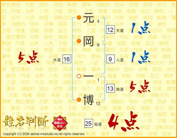 あなたの人生を表す1番重要な運勢です。生涯を通じて影響する総合運となり、主に50歳以降の晩年期に影響を及ぼします。苗字と名前の合計画数。