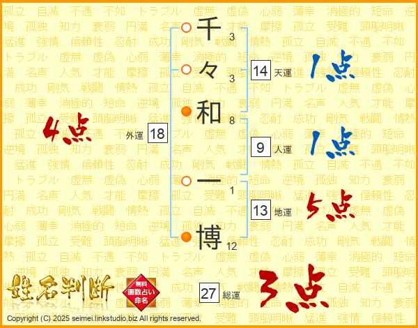 千(3画)々(3画)和(8画) 一(1画)博(12画)