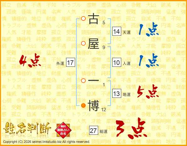 生活面を象徴する運勢です。外部から受ける影響力を表し、結婚運、家庭運や職場、環境への順応性を表します。総運から人運を引いた画数。姓や名が1文字の場合を除く。