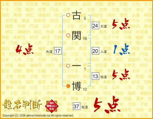 あなたの人生を表す1番重要な運勢です。生涯を通じて影響する総合運となり、主に50歳以降の晩年期に影響を及ぼします。苗字と名前の合計画数。